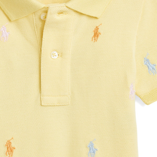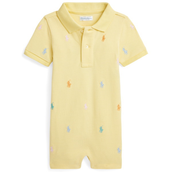 ブランドを象徴するポニー刺繍がたくさん入った注目度バツグンのショートオール。生地は通気・吸水性に優れたコットンカノコ。股はスナップボタンで開閉します。出産祝いなどのプレゼントにもおすすめです。